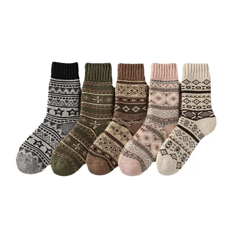 Step into the warmth you deserve with this luxurious 5-pair set of women’s winter woolen socks. Designed with thick knitted loops and a soft wool blend, these cozy long-tube socks provide exceptional insulation against cold weather while keeping your feet dry and comfortable. Their minimalist style and beautiful paisley patterns make them a charming everyday essential for the colder months.