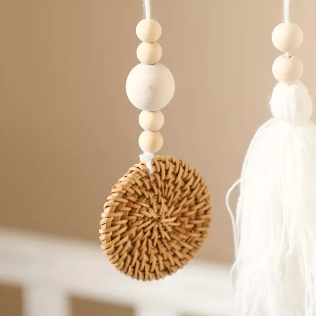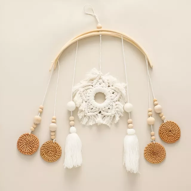 Introduce your little one to a world of gentle sounds and calming sights with this beautifully crafted wooden baby bed bell mobile. Designed to hang easily on cribs or strollers, this charming toy combines playful colors, soft music, and smooth wooden rattles to capture your baby’s attention while promoting early development. Its elegant boho style adds a natural, cozy touch to any nursery, making it both a delightful toy and a stylish accessory.