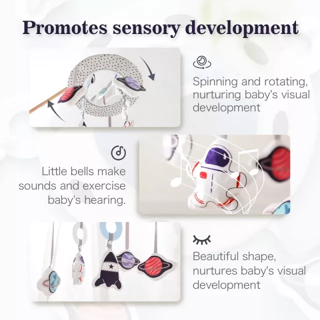 - Auditory Development: Gentle musical chimes soothe and stimulate your baby’s hearing.