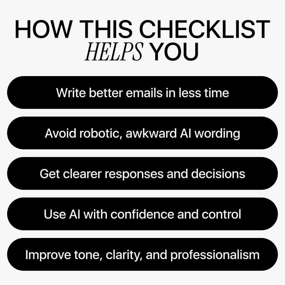 Unlike generic email templates or AI prompt lists, this guide focuses on decision-making, not shortcuts. It teaches you how to think before you prompt, how to evaluate what AI gives you, and how to refine the message so it feels natural and professional. The checklist format makes it easy to use repeatedly—whether you’re writing a quick follow-up or a high-stakes message.