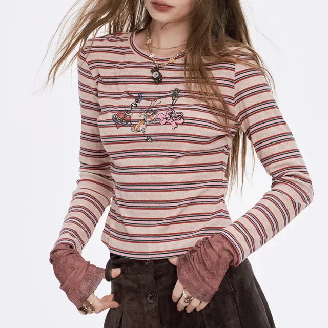 Y2K Casual Preppy Stripe Long Sleeve Round Neck T-shirt for Women