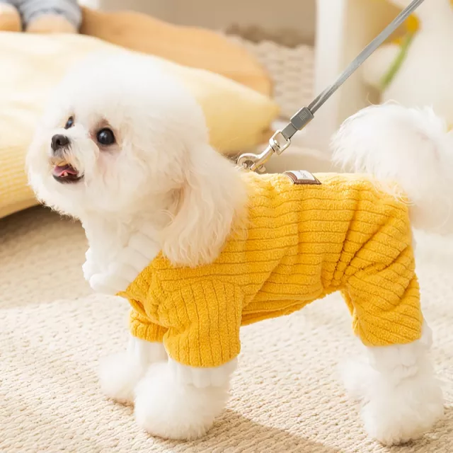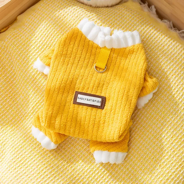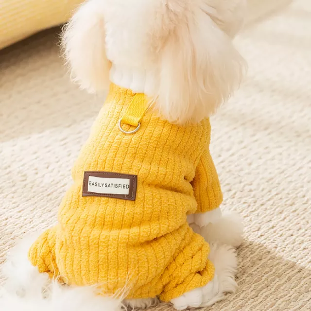 Wrap your little companion in comfort and charm with this Yellow Corduroy Dog Jumpsuit. Crafted with soft polyester corduroy on the outside and plush fleece lining on the inside, this four-legged coat is designed to keep your pup warm, snug, and stylish during chilly autumn days. The cheerful yellow color adds a pop of brightness to gloomy weather, while the simple cloth label detail gives it a touch of casual charm.