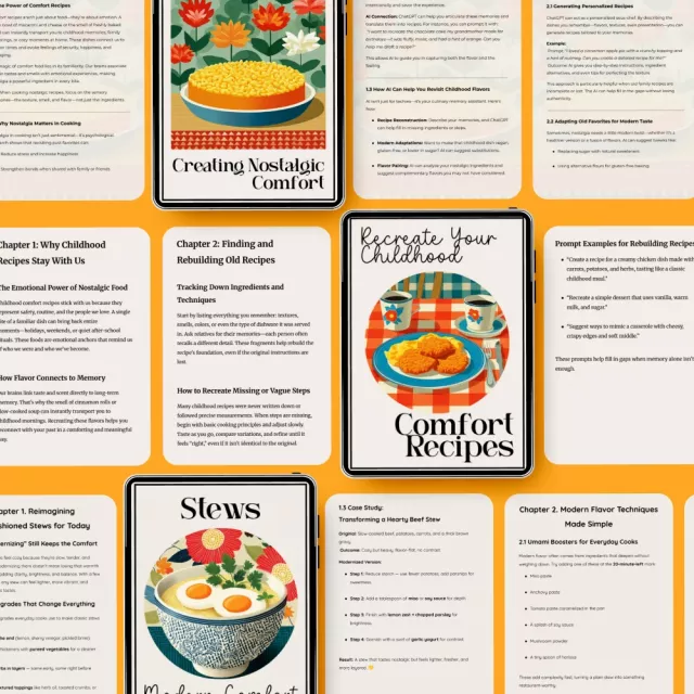 Unlike other recipe guides, this bundle doesn’t just give you a set of instructions – it empowers you to embrace the future of cooking with AI. Discover how to use AI to modernize retro recipes while still holding on to the flavors and emotions they bring. From creating updated comfort bowls to making old-school dishes healthier and more exciting, this bundle is your go-to resource for reimagining the classics!