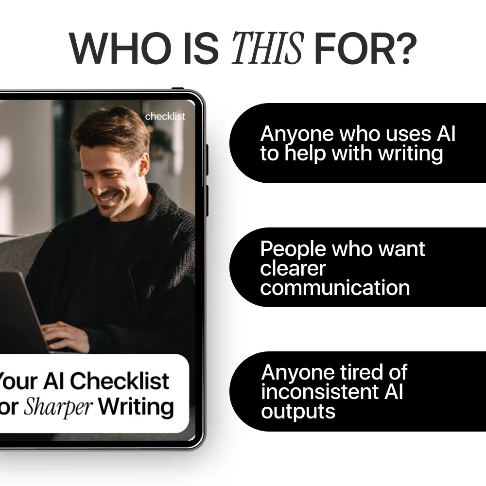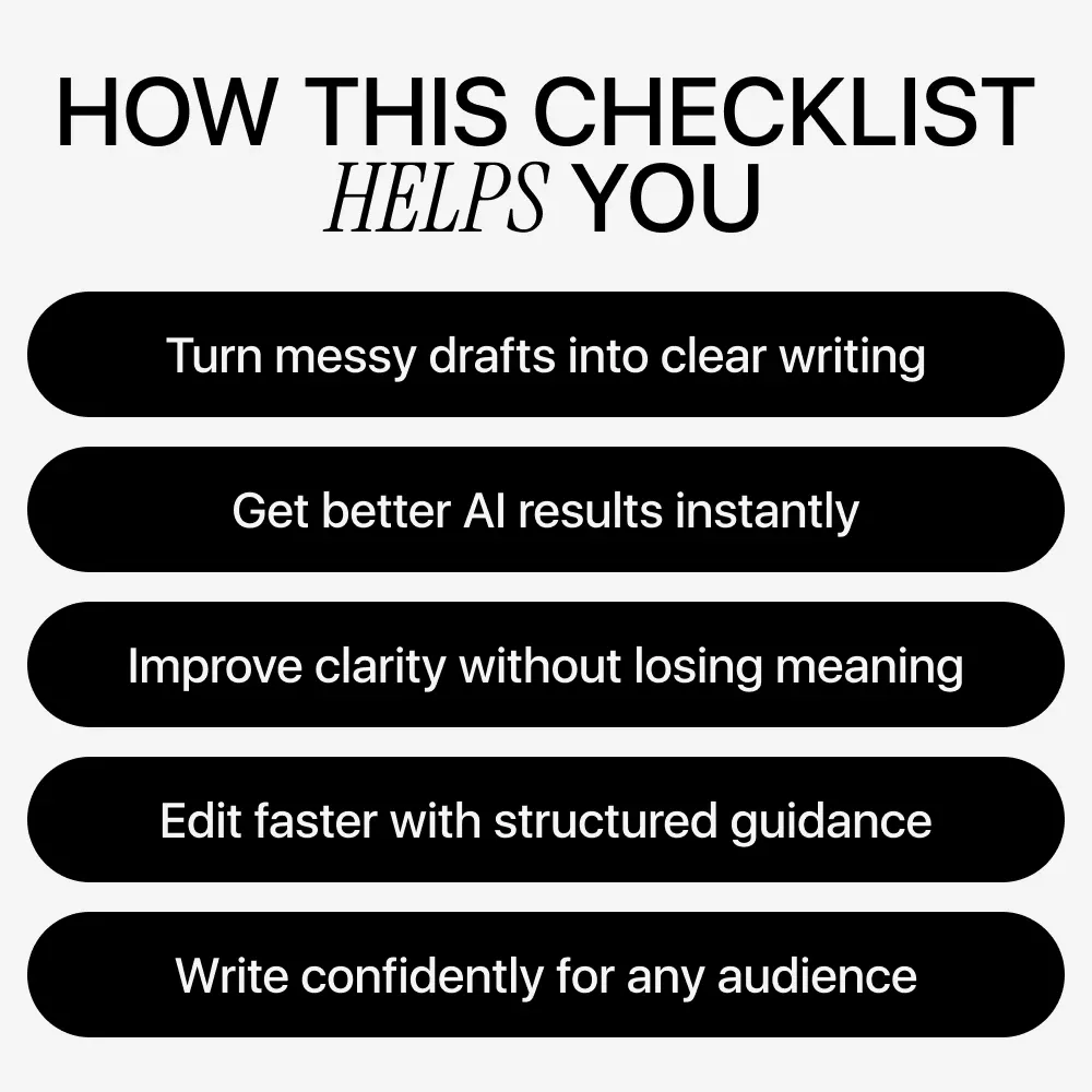 This checklist is ideal for writers, creators, students, marketers, business owners, and busy professionals who want clearer writing without overthinking the process. It’s especially helpful if you already use AI tools but feel like your results are inconsistent or “almost right.”