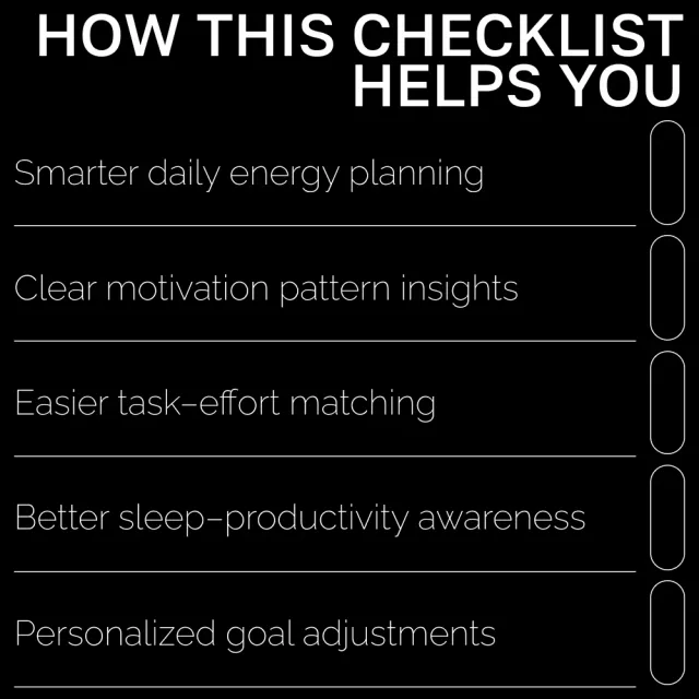 Unlock a smarter, more sustainable way to manage your energy, focus, and motivation throughout the day. Your AI-Powered Energy and Motivation Tracker is a guided digital checklist designed to help you understand your natural rhythms, optimize your workload, and elevate your productivity with the support of intelligent insights. Whether you’re a student, creative, entrepreneur, or professional, this tool transforms daily check-ins into meaningful patterns—making tracking energy and motivation with ai simple, intuitive, and genuinely life-changing.