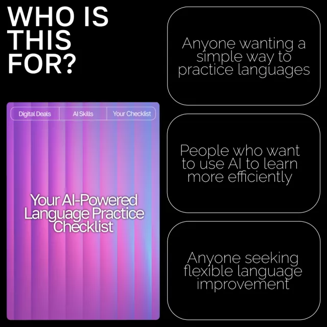 This guide is ideal for language learners, digital nomads, travelers, students, busy professionals, or anyone wanting a more effective and enjoyable study system. If you use AI tools and want clear direction on how to practice smarter—not harder—this resource is for you.