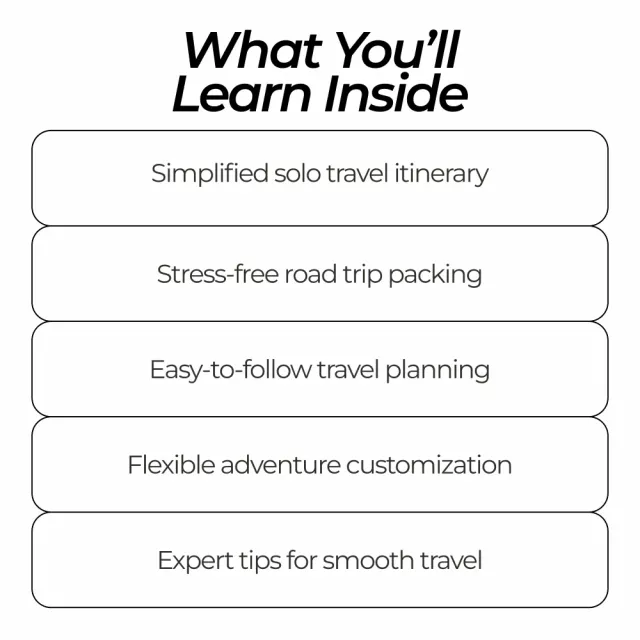 Loved using this resource on my recent solo adventure! The Smart Solo Road Trip Planner helped me make informed decisions about where to stay, what activities to do, and which destinations were worth visiting.