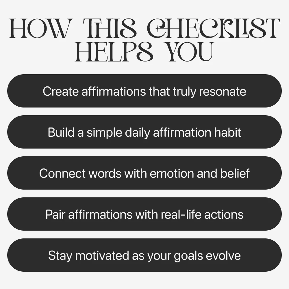 This checklist is perfect for anyone ready to shift their mindset and turn positivity into daily practice. Whether you’re working toward self-confidence, focus, or emotional balance, this guide makes affirmations simple, personal, and effective—no overthinking, just growth.