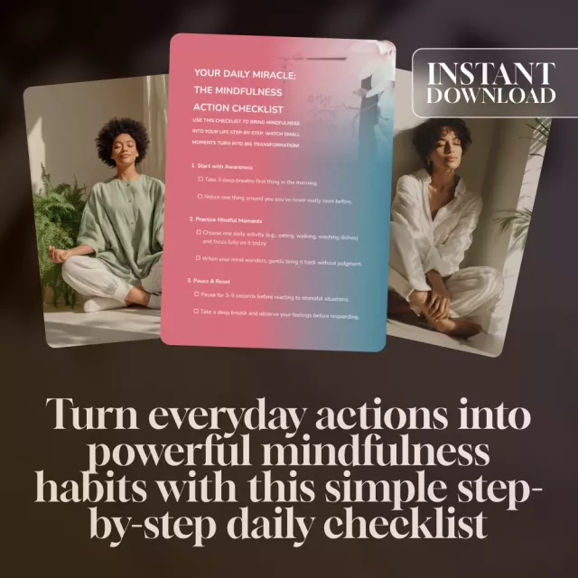 Unlock the miracle of mindfulness with Your Daily Miracle: The Mindfulness Action Checklist—a beautifully simple, easy-to-follow digital download designed to help you bring peace, presence, and purpose into your everyday life. Whether you’re new to mindfulness or returning to the practice, this actionable checklist gives you a step-by-step path to reconnect with yourself and the world around you. Watch how small, consistent shifts lead to big transformations—starting today.
