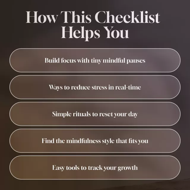 This checklist is ideal for anyone seeking more peace, presence, and balance—especially if you’re juggling work, family, or daily stress. Coaches, therapists, and wellness professionals will also find it a valuable tool to support clients in daily mindfulness practices.