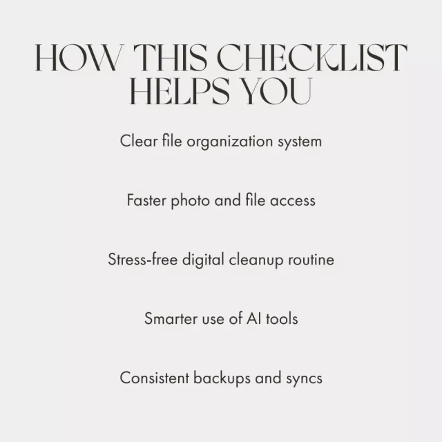 This checklist is perfect for photographers, small business owners, content creators, and everyday users who want to streamline their digital storage. If your desktop, camera roll, or cloud is overflowing, this guide will help you turn chaos into order — without the tech overwhelm.