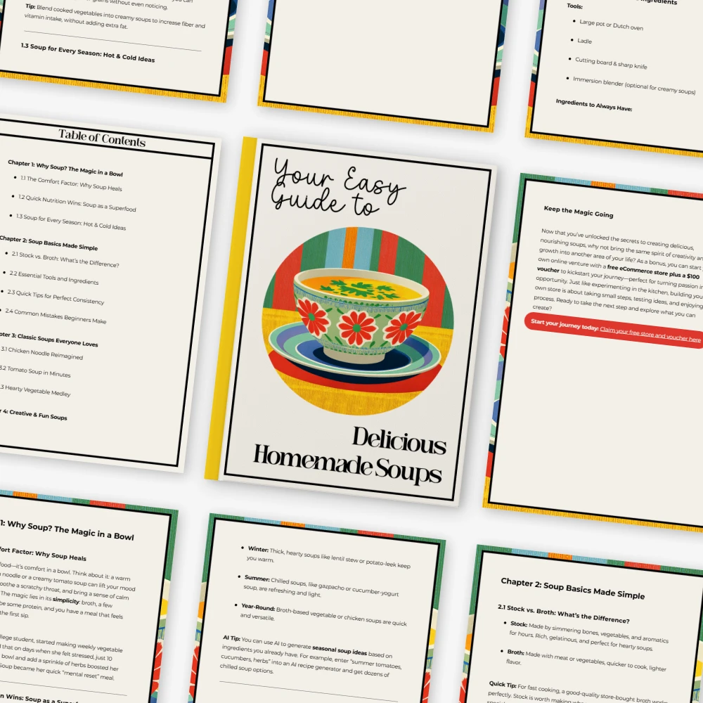 Unlike generic recipe PDFs, this guide blends practical cooking know-how with modern tools like AI meal planning, making it smarter, more useful, and truly beginner-friendly. It’s more than an ebook—it’s your personal pathway to easier, tastier homemade soups.