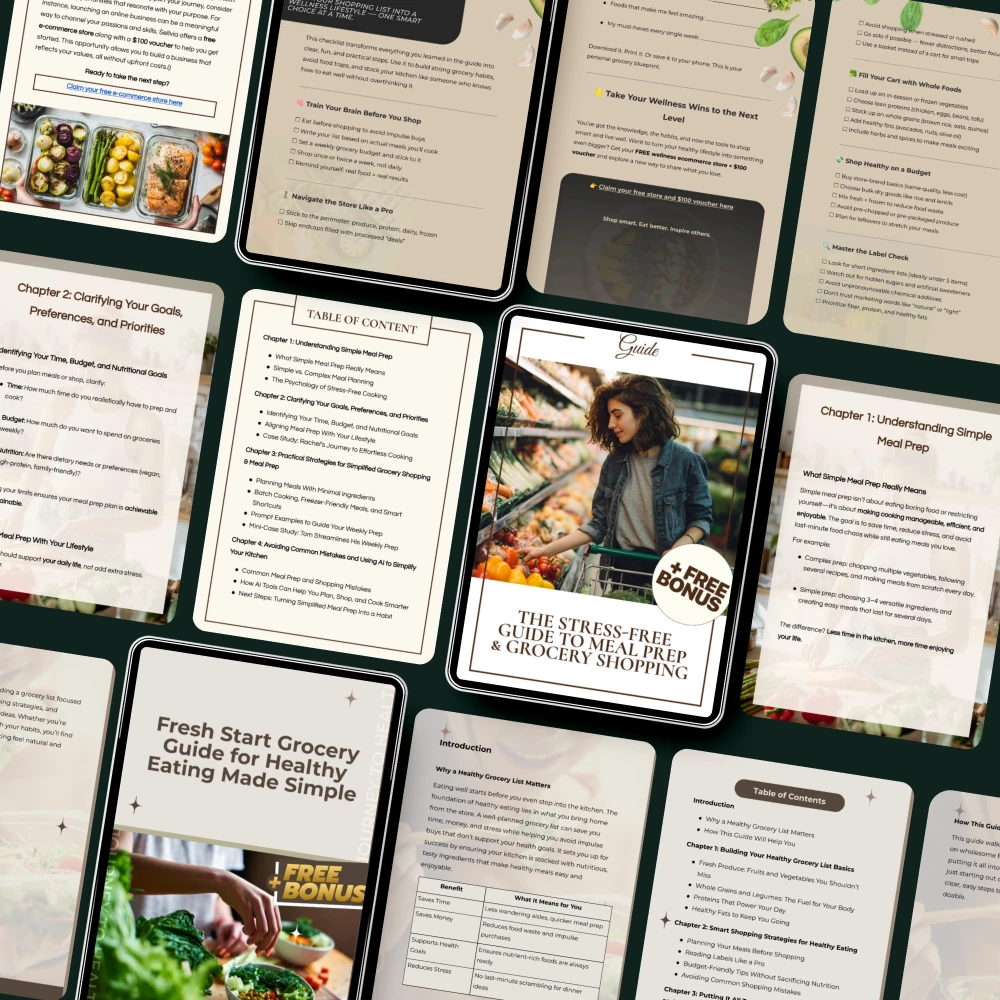 • Fresh Start Grocery Guide for Healthy Eating Made Simple: A perfect guide for beginners, helping you navigate the grocery store with ease while focusing on healthy, fresh ingredients.