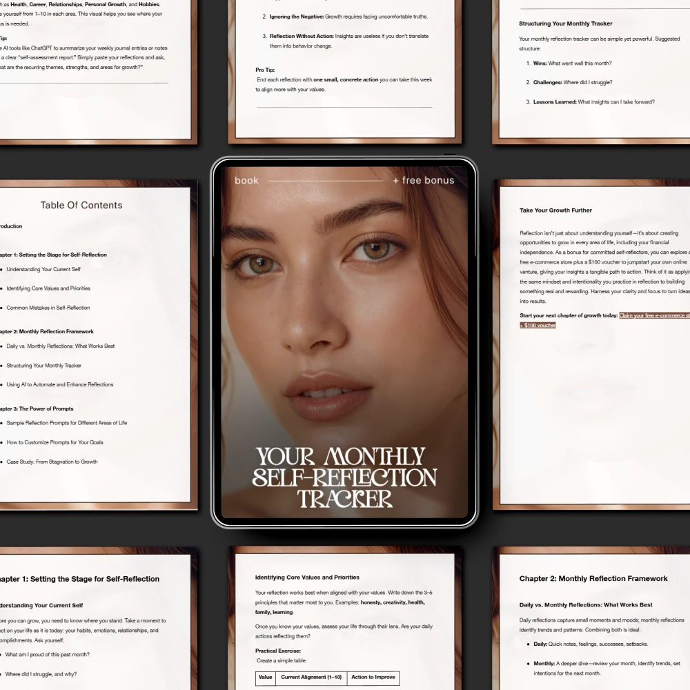 • Chapter 2: Monthly Reflection Framework – clear structure for your tracker and how to use AI for deeper insights