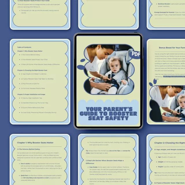 Your Parent’s Guide to Booster Seat Safety is a clear, practical digital guide designed to help parents make confident decisions about protecting their children in the car. Written in simple, easy-to-follow language, this guide breaks down the most important child booster seat safety rules without overwhelming you. Whether you are installing a booster seat for the first time or wondering if you are still doing it correctly, this guide gives you peace of mind and reliable information you can trust.