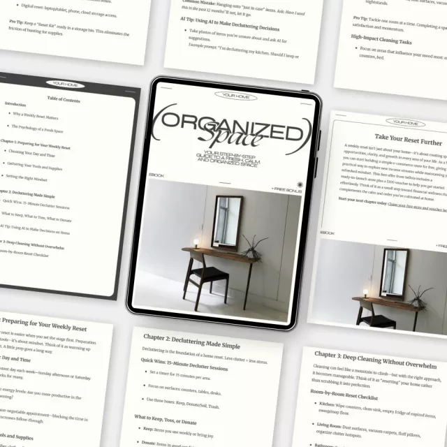 Take the first step toward a cleaner, calmer home today. Download Your Step-by-Step Guide to a Fresh, Calm, and Organized Space and discover how to set up a weekly home reset that truly works for you. Your peaceful, organized lifestyle begins now—start your reset today!