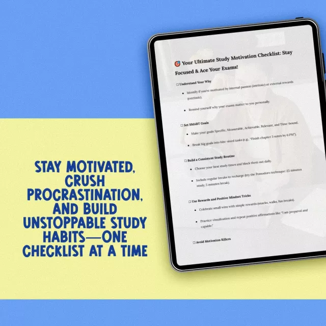 This checklist is for students of all ages—from high schoolers to adult learners—who want to take control of their study habits and finally figure out how to motivate yourself to study for exams. If you’ve ever sat at your desk feeling stuck, distracted, or defeated, this tool was made for you.