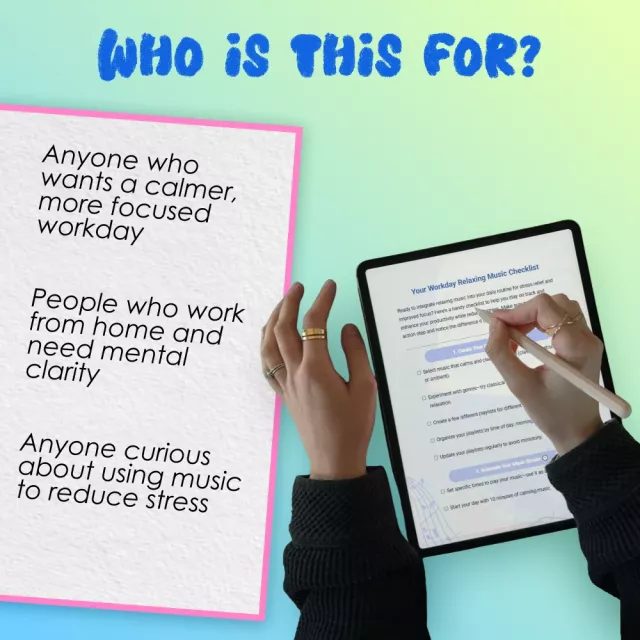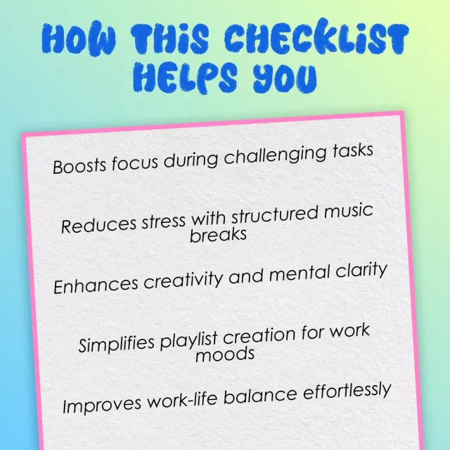 Created for busy professionals, remote workers, creatives, and anyone seeking a more peaceful workflow, this checklist guides you step by step through curating music for different times of day, optimizing your environment, and using music intentionally to improve your workday mood.