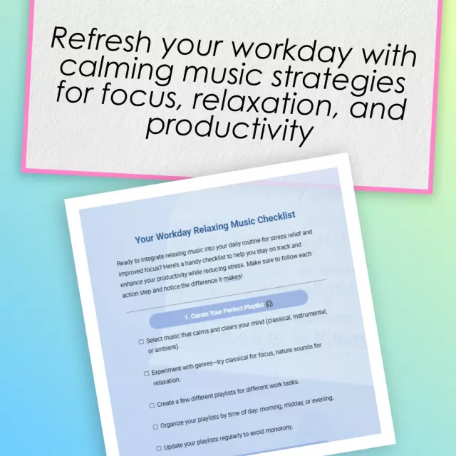 Take control of your environment and mental space with Your Workday Relaxing Music Checklist. This beautifully crafted digital guide makes it easy to incorporate relaxing music for work stress relief—no music background or fancy tools needed. Download now and start transforming your workday one peaceful note at a time.