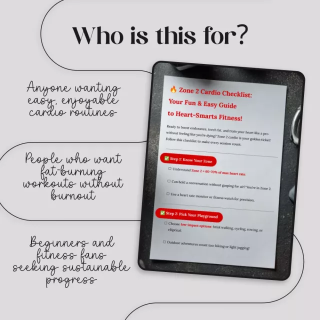 Ready to train smarter, not harder? The Zone 2 Cardio Checklist: Your Fun & Easy Guide to Heart-Smarts Fitness! is your go-to digital download for building endurance, burning fat, and improving heart health—without feeling drained. If you’ve ever wondered what is zone 2 cardio and how it can transform your fitness journey, this step-by-step checklist makes it simple and practical to follow. Perfect for beginners and seasoned fitness lovers alike, this printable resource will keep you consistent, motivated, and on track with every session.